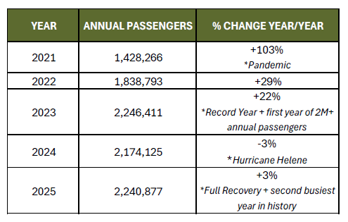 Despite significant challenges, including impacts from Hurricane Helene and ongoing terminal construction, AVL demonstrated remarkable resilience and sustained passenger growth.