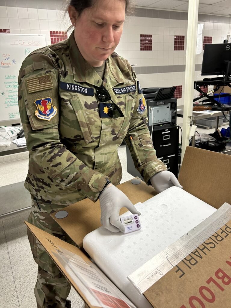 “My team and I were proud to respond immediately when called. Within hours, our members were on-site helping process critical blood shipments destined to support our troops,” said Col. Amy Myzie, New Jersey Wing commander.