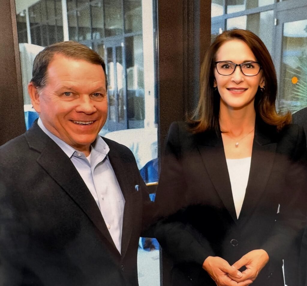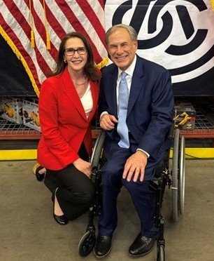 Shelly deZevallos, chair of the Texas Governor’s Aerospace and Aviation Advisory Committee, with Texas Governor Greg Abbott at a policy event in Austin, Texas.